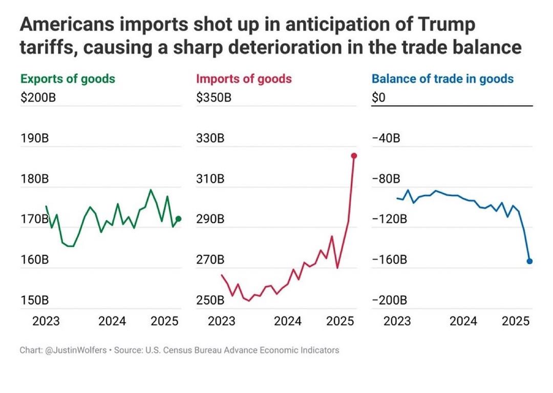 Americans responded (sharply!) to the Trump tariffs *before* they were even imposed. They imported extra stuff in December and January, rather than waiting and paying the higher prices that would occur when he was in office.