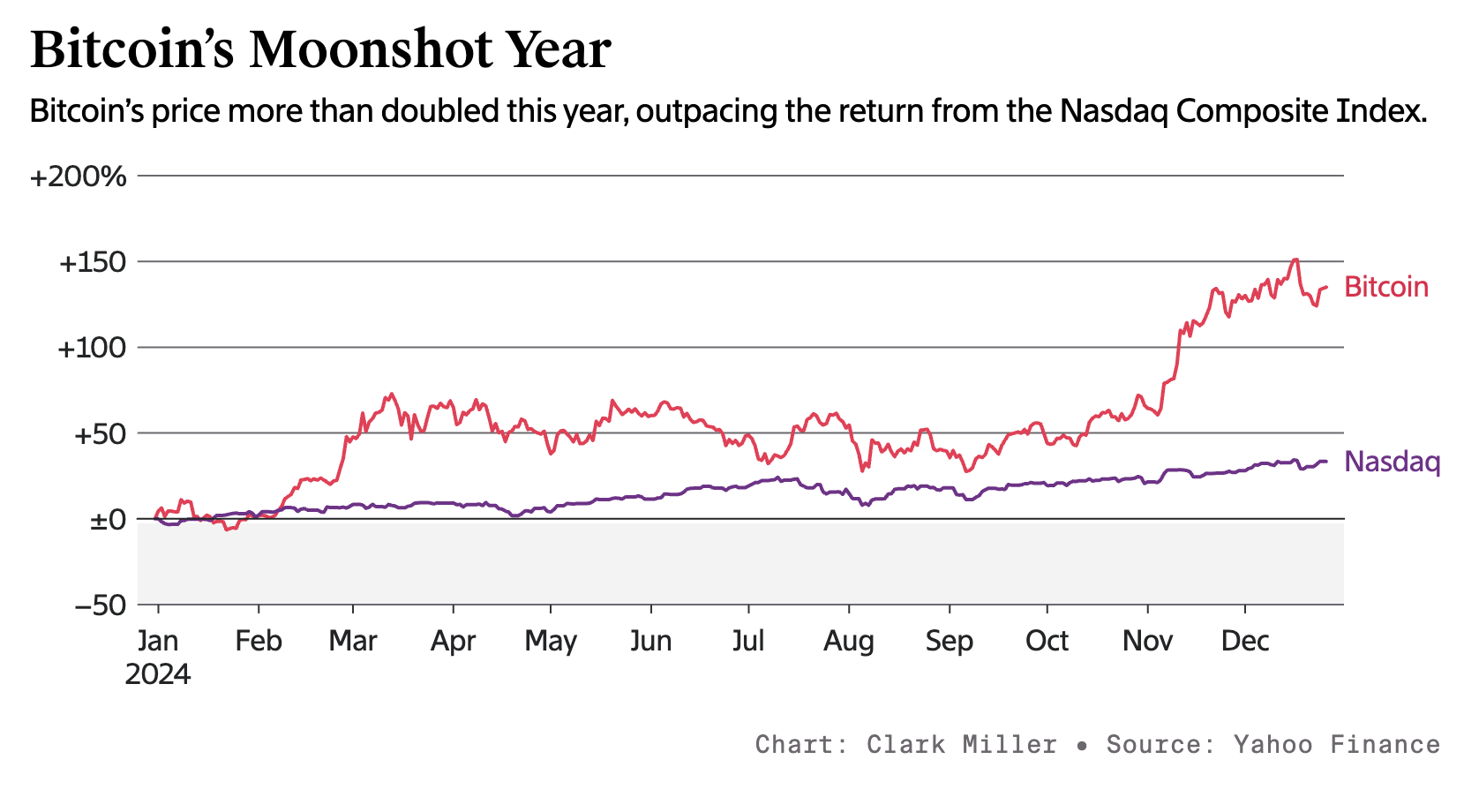 The largest #Crypto , invented by pseudonymous developer Satoshi Nakamoto in 2008, now has a market capitalization of nearly $2 trillion. Bitcoin’s price more than doubled in 2024, easily outpacing the 35% return of the Nasdaq Composite Index for the year.