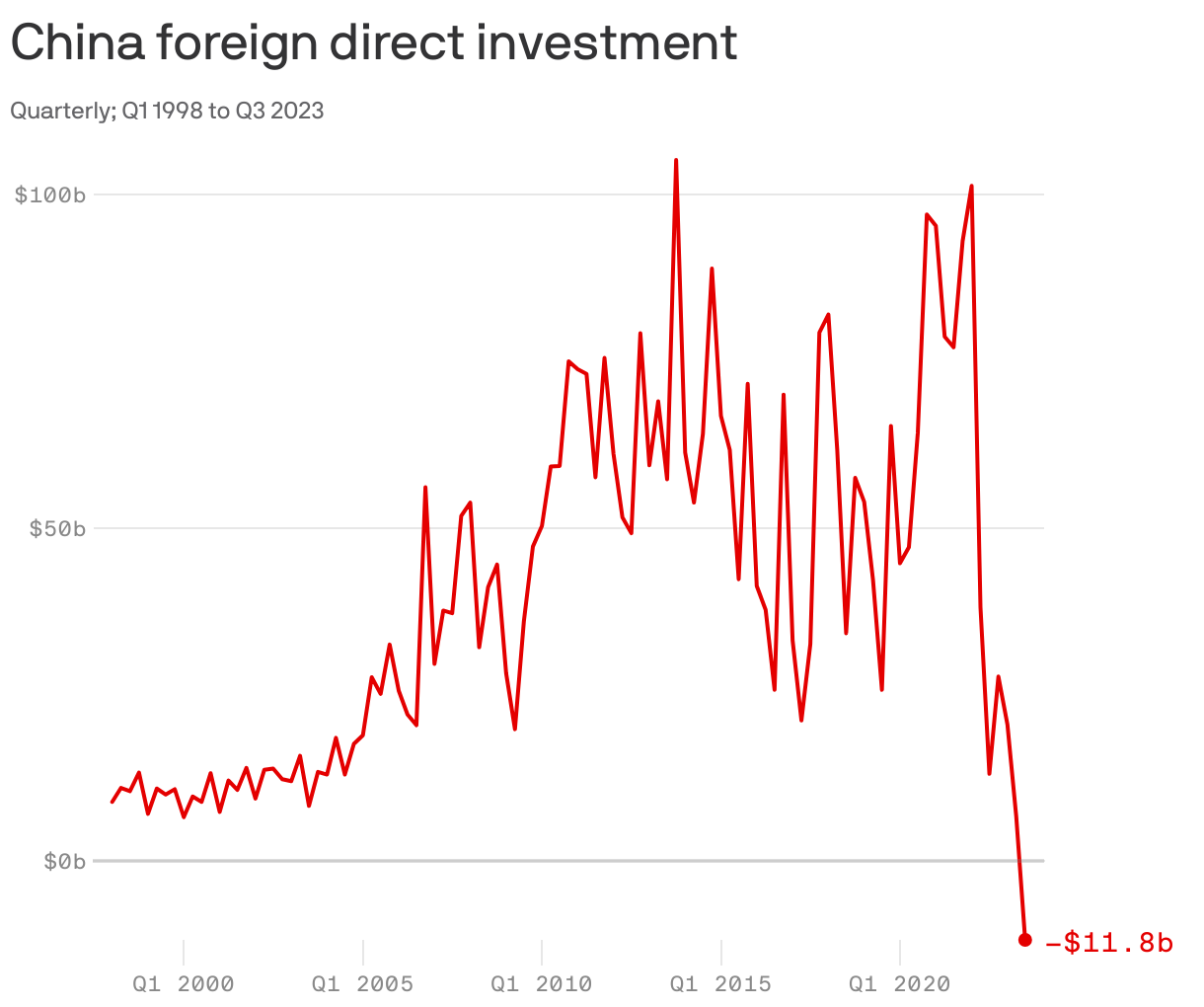 The outflow of foreign direct investment, or FDI, is a reflection of the sharp deterioration in China's economic prospects. The world's second-largest economy continues to struggle with a sluggish COVID recovery, a deterioration in consumer and business confidence, and ongoing decoupling and deglobalization trends.
