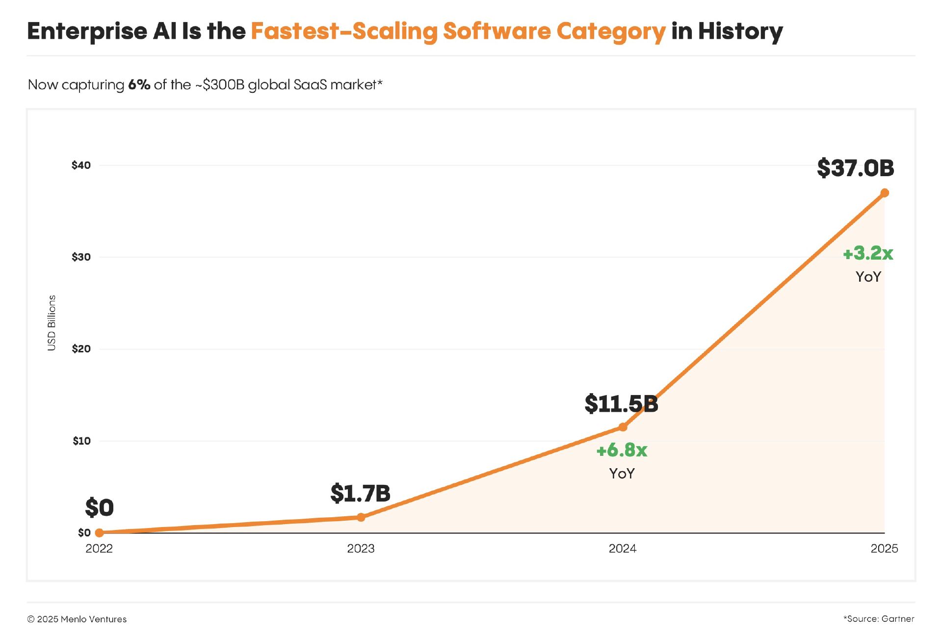 Departmental AI spending hit $7.3 billion in 2025, up 4.1x year-over-year. Coding alone went from $550M in 2024 to $4.0B in 2025. That’s 7x growth in twelve months.