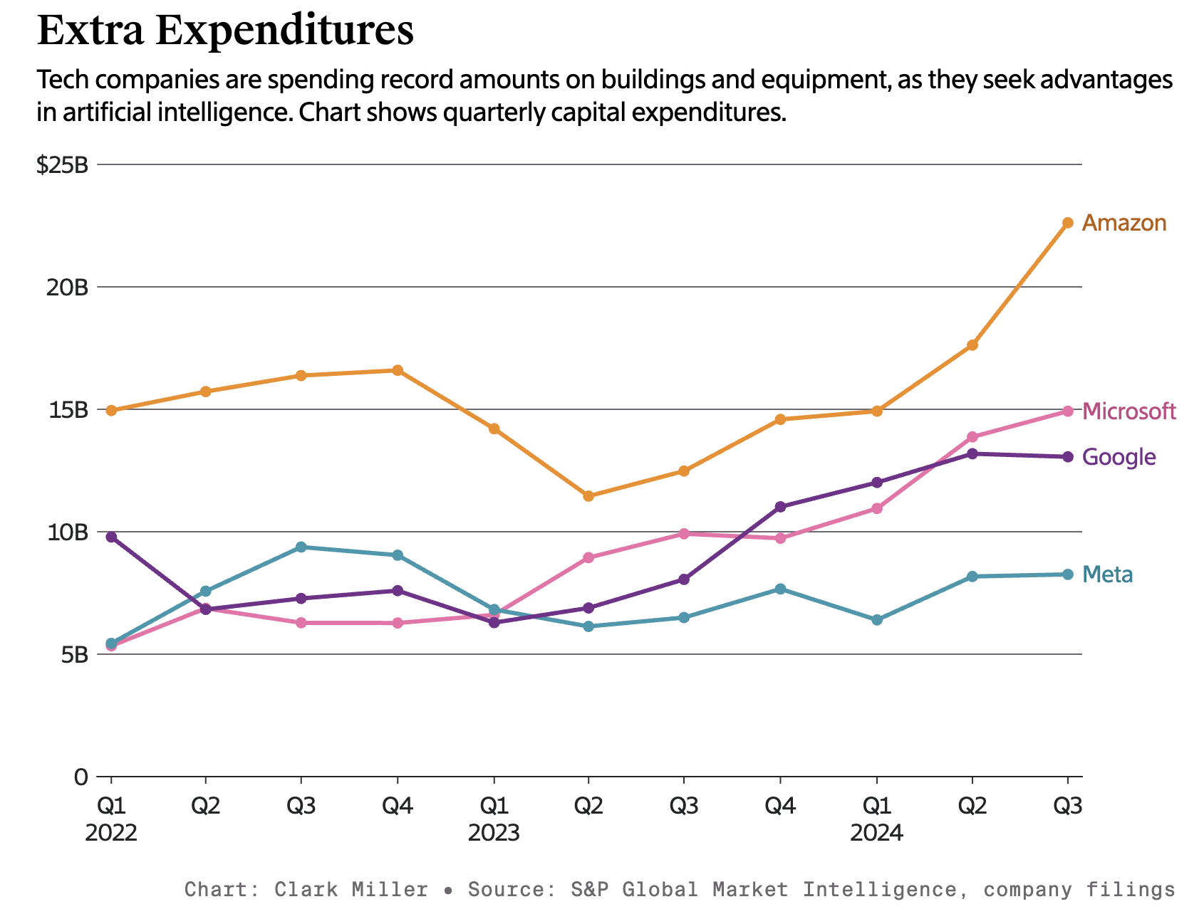 Amazon, Microsoft, Google and Meta Platforms collectively reported more than $150 billion in capital expenditures through the first nine months of the year, up 50% from the same period a year earlier.