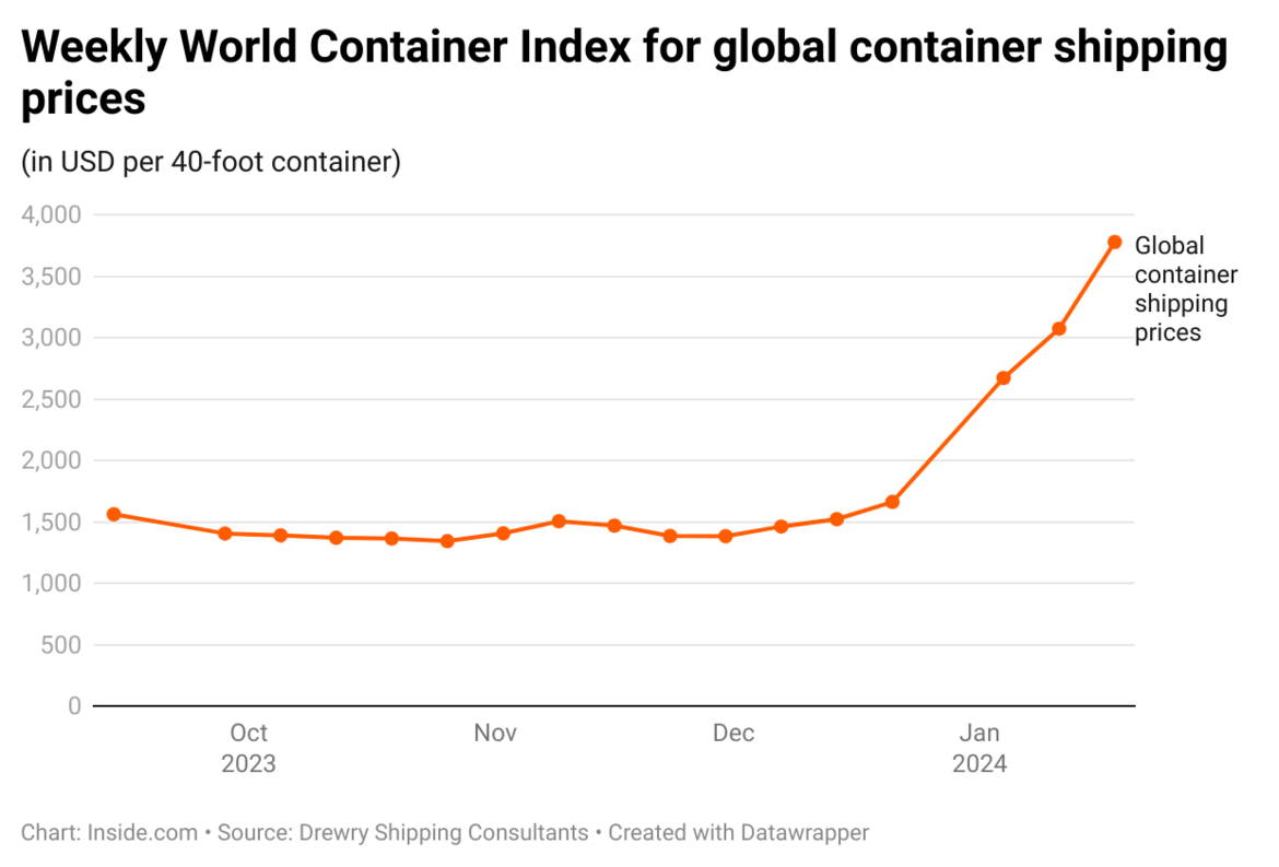 Relevance: Global shipping route disruptions, notably in the Suez Canal, are causing supply chain delays and higher transportation expenses, aggravated by Houthi rebel attacks in the Red Sea, resulting in increased volatility and shipping difficulties. This affects multiple industries, leading to production suspensions and logistical challenges for manufacturers and retailers.